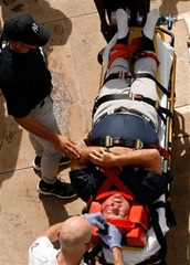 Merrill was collecting balls near a screen behind second base when he was struck by a ball thrown from the outfield. He was taken off the field on a stretcher.
